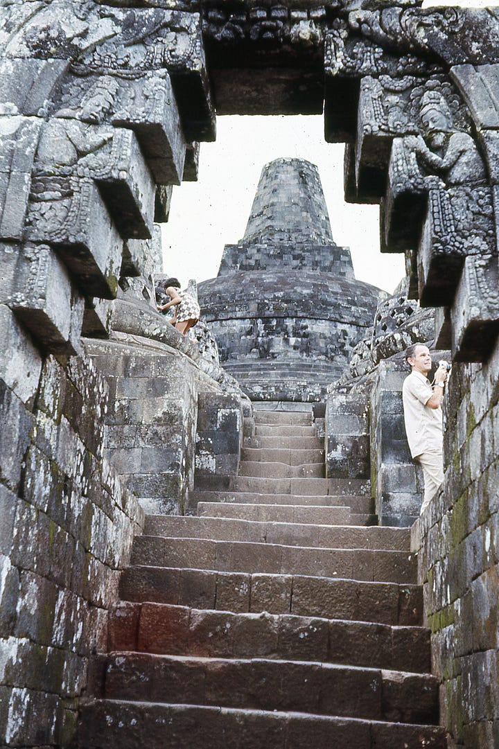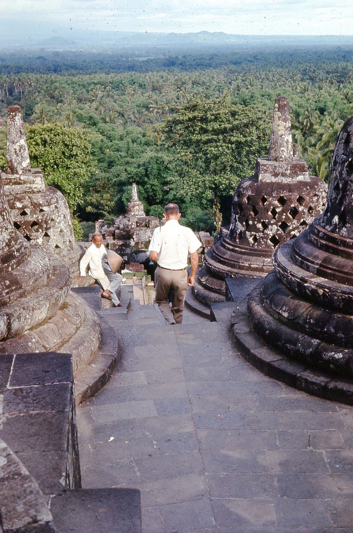 We went at once to Borobudur—8th century Hindu-Djavanese Art. Not a temple. Buddhist sanctuary, a massive “stupa”—commemorate and shelter sacred relics. It has 155 bell-shaped stupas, each with a Buddha. All the heads of the Buddhas were missing. (When we visited the museum in Djakarta we saw some of the heads.) In 13th century traders began to introduce Islam. Most local kings were converted. The last king of the empire of Madjopakit, rather than surrender, committed suicide. His son and followers went to Bali where a Bali-Hindu culture still flourishes. After this we went shopping for batiks.