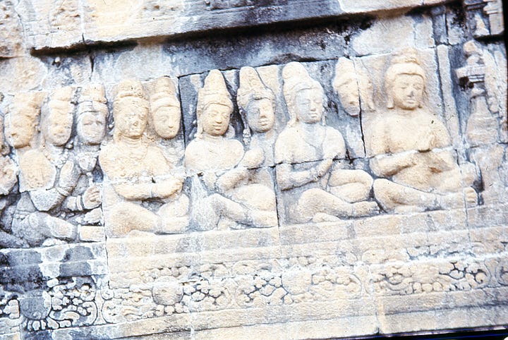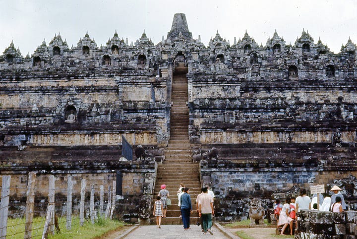 According to this article, there are no known records of the construction or intended purpose of Borobudur (although they do refer to it as a temple). It was abandoned for centuries. Restoration began in the early 1900s, but stalled at some point. The Indonesian government and UNESCO undertook a major project between 1975 and 1982, and it is now listed as a World Heritage Site. Here’s a picture of a Buddha head from Borobudur that is in an Amsterdam museum.