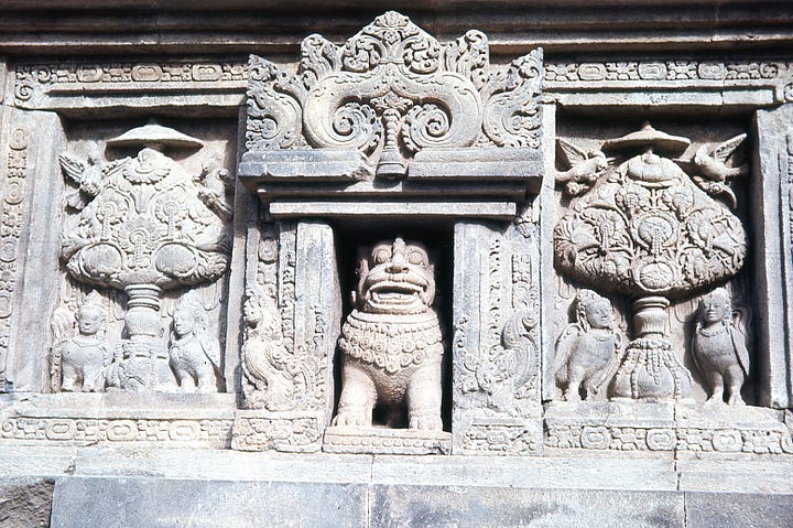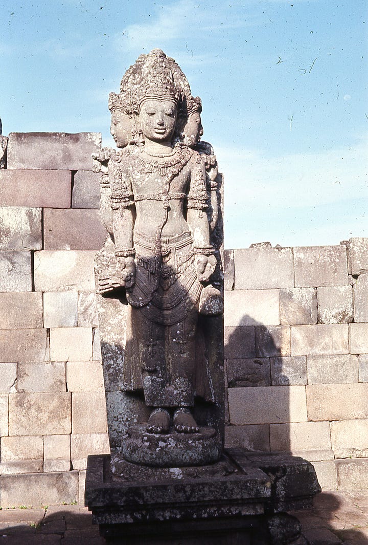 According to this article, Prambanan is the largest Hindu temple site in Indonesia, and is dedicated to the Trimurti—the expression of God as the Creator (Brahma), Preserver (Vishnu), and Destroyer (Shiva). As with Borobodur, the site had been abandoned and was restored from ruins. At the time K was there, only the Shiva temple had been reconstructed (perhaps her reference to “Ciwa”), but the Brahma and Vishnu temples have since been rebuilt, along with a number of other temples and shrines. Here are some of K’s pictures from Prambanan.