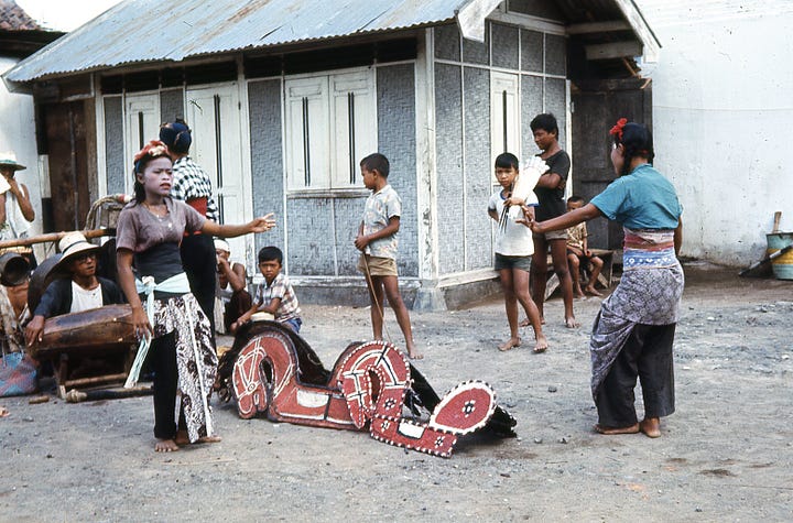Kuda Lumping is a traditional Javanese dance in which dancers “ride” horses made from woven bamboo. It sometimes involves the dancer entering a trance, traditionally said to be caused by spirit possession. Here are some pictures K took of the dancers.